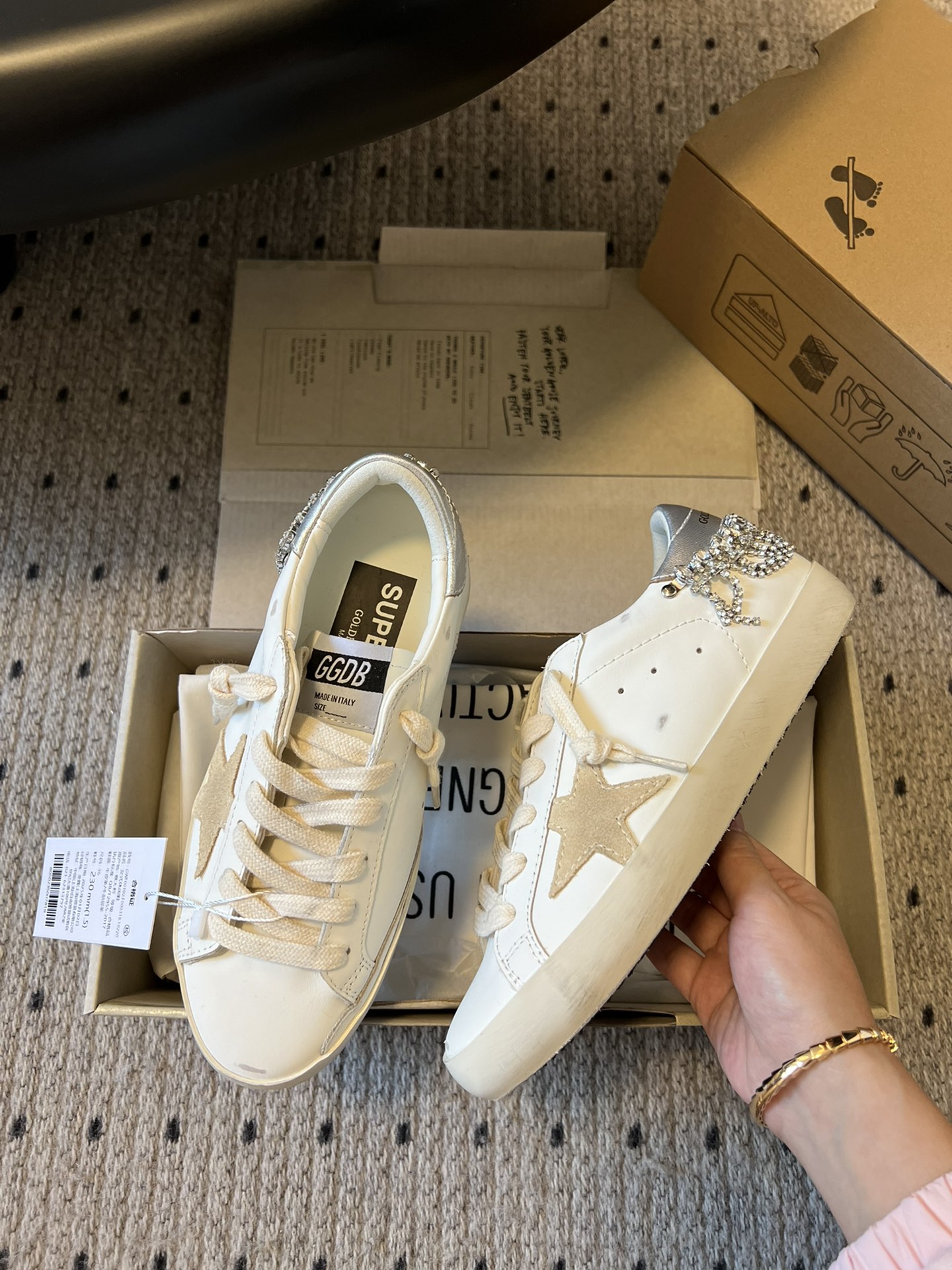 This shoes is AAAAA 1:1 quality (superb). Materials used are identical to the original ones. Golden Goose trademark marks are indistinguishable to the authentic. Photos take by actual shoes, what you receive will be 100% same with our photos.